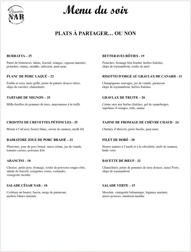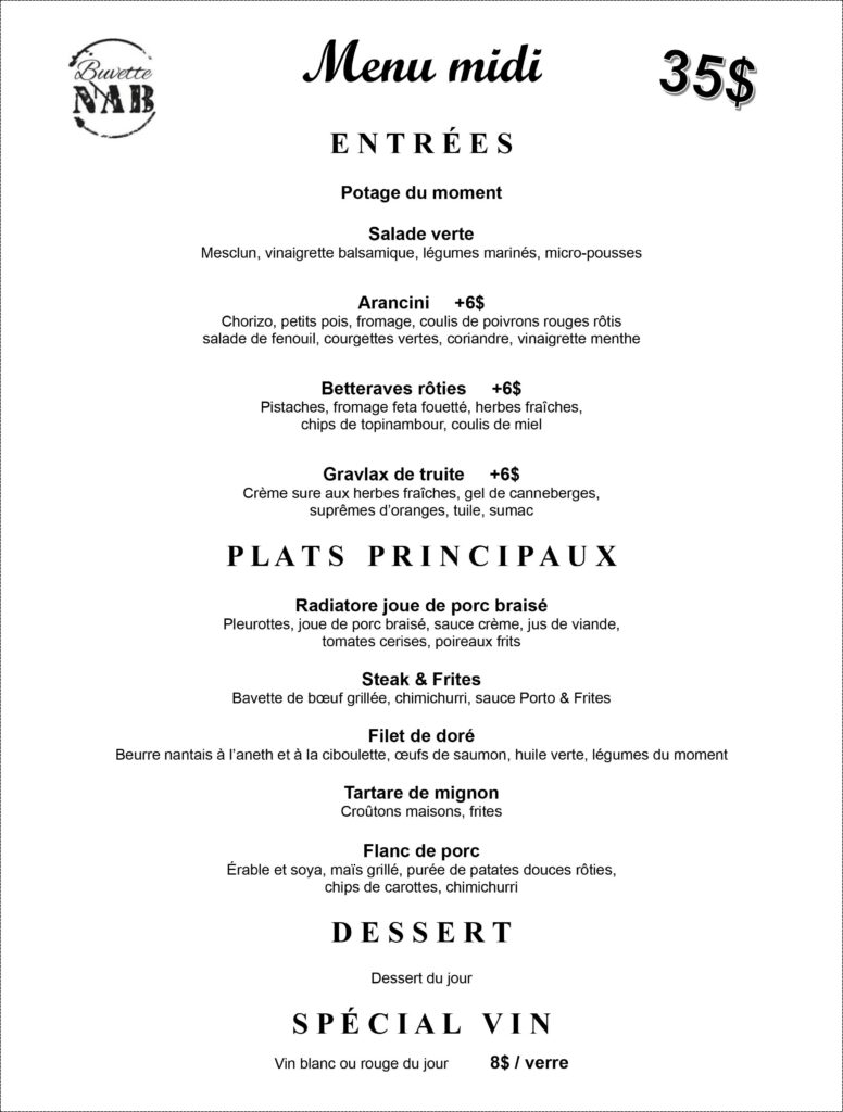 Située à Beloeil, Buvette NAB est un lieu où l‘authenticité rencontre l’excellence. Notre cuisine du marché privilégie les produits frais et de saison, transformés avec passion par notre chef. Spécialisés dans le gibier, les poissons et les pâtes maison, nous créons une expérience culinaire unique dans une atmosphère chaleureuse et conviviale..
