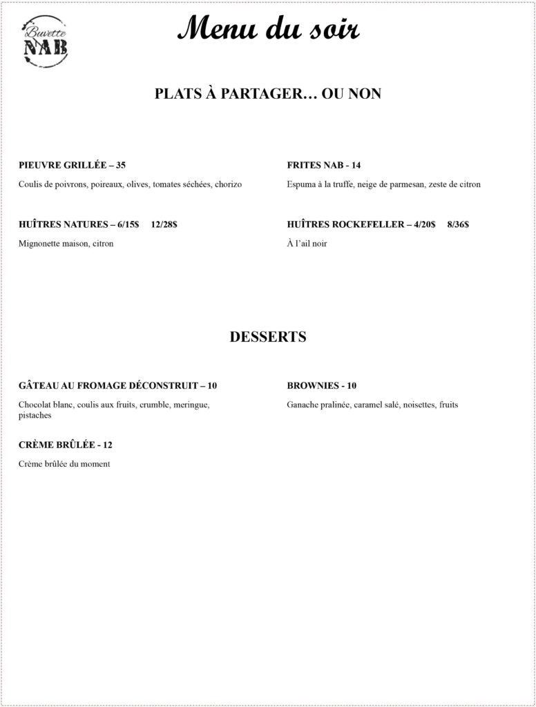 Que ce soit pour célébrer un anniversaire, organiser un dîner d‘affaires ou simplement passer une soirée mémorable entre amis, Buvette NAB vous offre le cadre parfait pour vos moments d’exception.